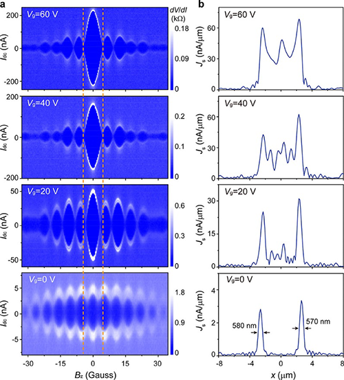 图2.(a)Bi2O2Se约瑟夫森结在不同门电压下的超流衍射和干涉图。(b)相应门电压下提取的超流空间分布。