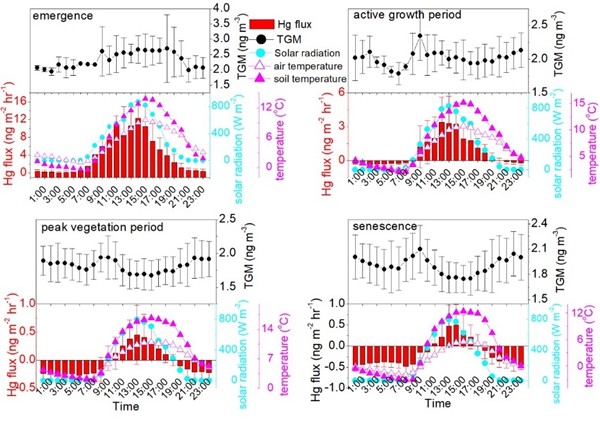 地-气界面汞交换对区域大气汞浓度可产生重要影响。在植被萌动期,大气汞浓度的日变化特征与地表释汞通量相一致,表现为下午高值、晚间低值(图3)。其他各生长期,大气汞均呈现黎明前低峰值和日出后的“早晨峰值”,与地表汞通量黎明前为沉降、日出后为释放相对应。此外,大气汞浓度随植被生长呈显著降低趋势,进一步表明地表汞通量对大气汞浓度的影响。植被通过影响地-气汞交换过程,同样主控了大气汞的季节变化。
