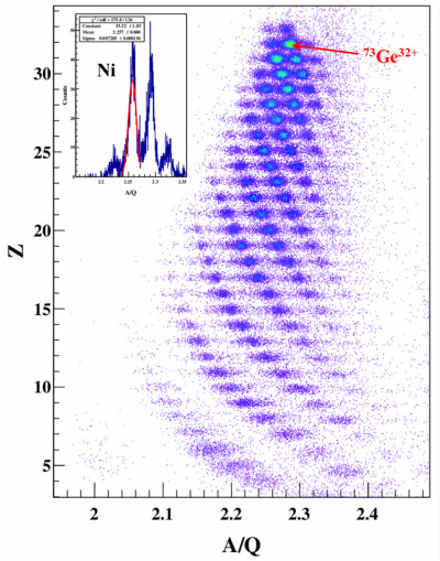 300 MeV/u 78Kr轰击1.84 mm厚的Al2O3,RIBLL2束线磁刚度按目标核73Ge设置时,RIBLL2至外靶段的粒子鉴别谱,图中小图为Ni同位素的A/Q分布