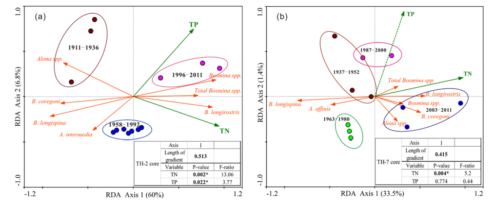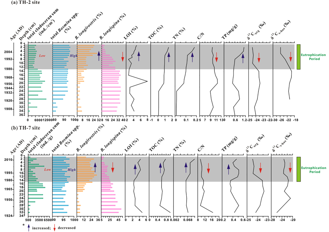 图1 地球化学指标(TOC, LOI, TP, TN, C/N, δ13Corg和δ13Cs-bos) 和枝角类总数及象鼻溞丰度变化:(a) TH-2孔,(b)TH-7孔