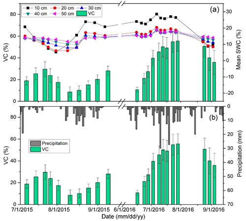 植被盖度在2015和2016生长季的时间分布及对降雨和土壤含水量的响应特征