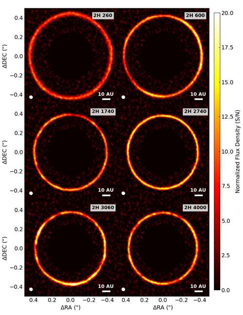 图3. 双流体不稳定性使得尘埃环产生大量的非方位对称的亮斑结构。