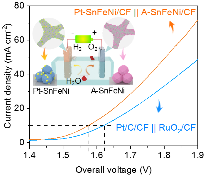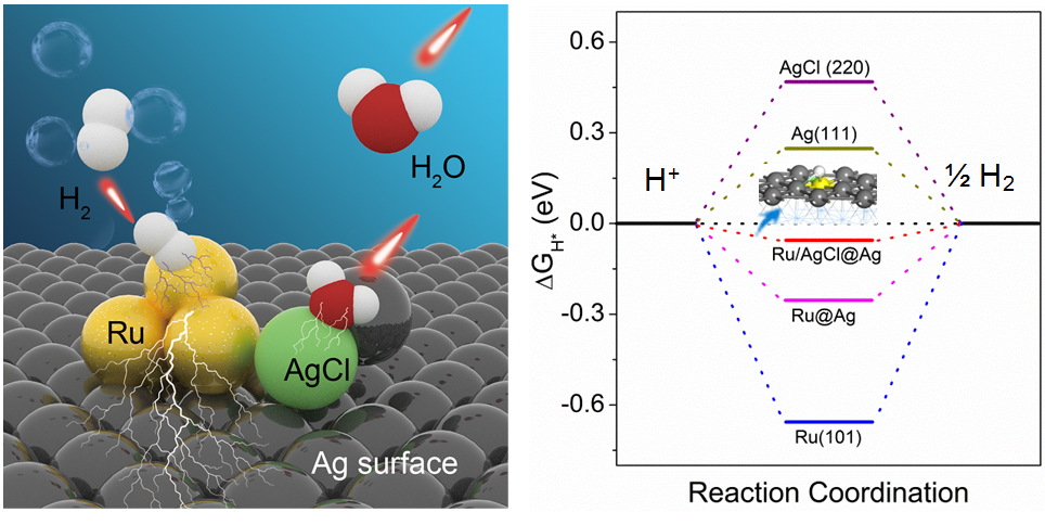 上海硅酸盐所研究员王家成带领的电催化材料与能源器件团队利用3D高导电泡沫铜为基底,生长了钙钛矿SnFeNi氧化物并将其活化,开发出A-SnFeNi和低Pt负载的Pt-SnFeNi催化剂分别用于氧析出和氢析出催化剂。该类催化剂中多孔泡沫金属利于气体分子的扩散和释放,并促进催化剂/载体界面的电荷转移,表现出高效的催化活性和稳定性。相关工作以In Situ Growth of Free-standing Perovskite Hydroxide Electrocatalysts for Efficient Overall Water Splitting 为题发表在英国化学会期刊J. Mater. Chem. A(2020, 8, 5919-5926)上,并入选Hot Paper。该团队进一步以高导电3D Ag纳米线网络为基底,制备了一种复合网络型HER催化剂(Ru/AgCl@Ag)。经实验与计算模拟相结合发现AgCl中氯的高电负性促进了水分子吸附和解离,而来自Ru的d带电子协同调节表面的氢吸附/解吸能。相关研究成果以Geometric Structure and Electronic Polarization Synergistically Boost Hydrogen-Evolution Kinetics in Alkaline Medium 为题发表在美国化学会期刊J. Phys. Chem. Lett.(2020, DOI: 10.1021/acs.jpclett.0c00703)。以上两项工作的第一作者均为上海硅酸盐所与北京工业大学联合培养博士生李善霖,上海硅酸盐所副研究员马汝广、研究员王家成和北京工业大学研究员刘丹敏为共同通讯作者。