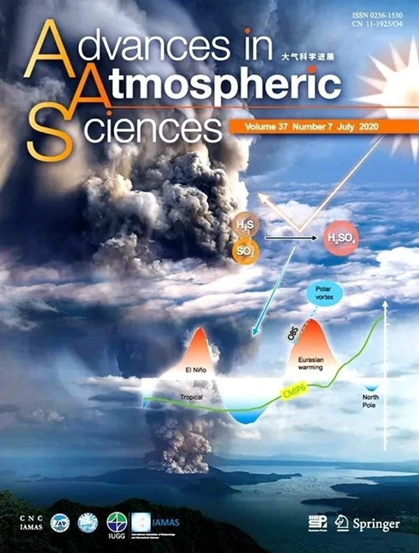图:《大气科学进展》2020年第7期封面。封面背景是一次强烈的火山喷发,喷发出大量的火山灰等气体进入对流层以及平流层,SO2以及H2S气体和水蒸气作用产生H2SO4硫酸盐气溶胶,能够反射部分太阳短波辐射,削弱进入到地表的辐射,造成冷却效应,并在地表气温表现为厄尔尼诺以及欧亚大陆增暖的现象。