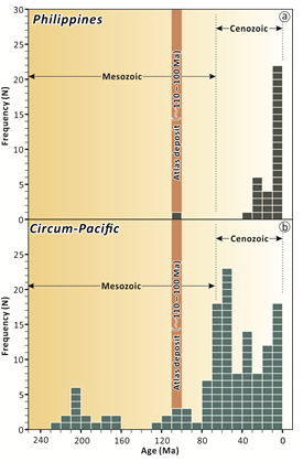 图2 菲律宾(a)和环太平洋(b)斑岩型铜矿床年龄统计图