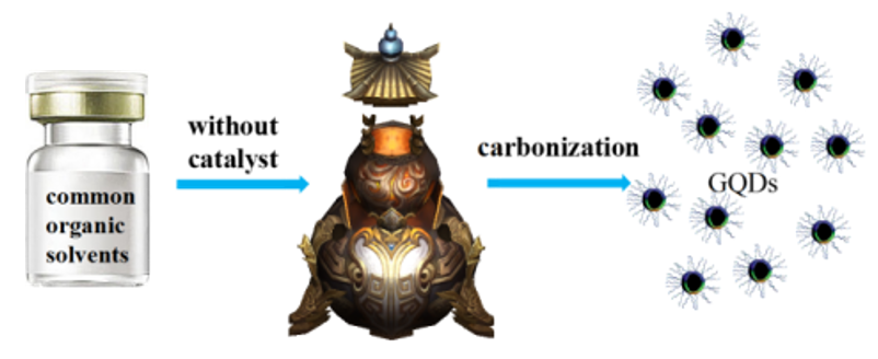 近年来,因具有材料稳定性、生物相容性、荧光可调性以及易被肾脏清除等特点,GQDs在生物医学领域引起了极大关注。由于合成过程的易操作性、前驱体种类的多选择性及理化性质的原位调控能力,有机分子的溶剂热分解是“自下而上”制备GQDs的主要手段之一。在常规理解中,有机溶剂在反应体系中起到分散前驱体及提供反应溶液体系的作用。然而,有机溶剂本身也是一种小分子,其在 GQDs 合成过程中是否分解还尚未可知。