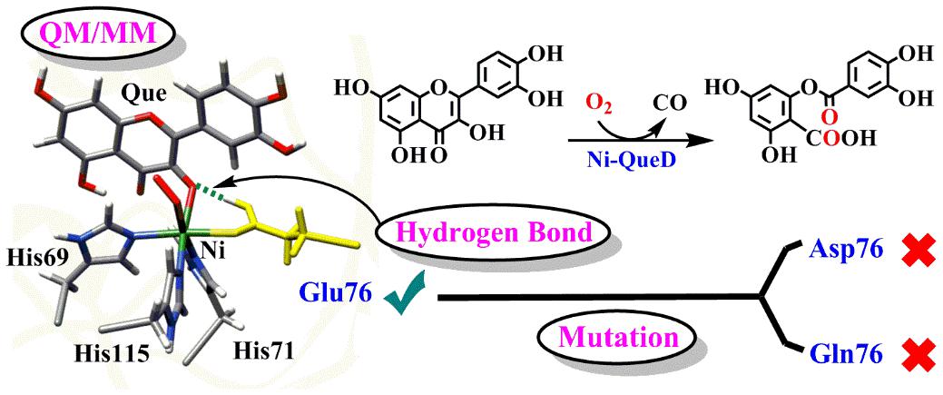 中国科学院福建物质结构研究所结构化学国家重点实验室李春森课题组在国家自然科学基金重点项目和中科院战略性先导科技专项等的资助下,采用组合QM/MM计算方法以及MD模拟方法,深入研究了野生型含镍槲皮素2,4-双加氧酶(Ni-QueD)及其Glu76Asp和Glu76Gln两种突变体催化氧化降解槲皮素的反应全过程,发现并阐明了Ni-QueD通过活性中心Ni原子配位的Glu76残基采取质子耦合电子传输过程(PCET)引发底物氧化反应,并利用Glu76与底物的氢键相互作用和转换来调控实现底物的选择性氧化开环裂解的特殊反应机制。此项研究工作不仅为深入理解金属酶利用关键氨基酸残基来调控催化反应活性提供了理论见解,也为人工合成类似QueDs的仿生催化剂、实现特定催化反应提供了新的思路。