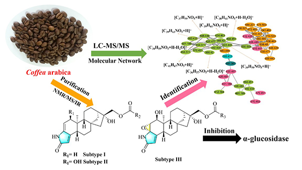 最近,邱明华团队又从云南咖啡的熟豆中发现一系列咖啡二萜内酰胺型化合物Cafemide A-G,根据化学结构特点将其分为I-III亚型。将基于LC-MS /MS的分子网络技术运用于痕量内酰胺型咖啡二萜的追踪发现,快速鉴定出7个新颖的咖啡二萜II亚型内酰胺化合物,并通过多级质谱碎片的形成推导对其结构进行了验证。LC-MS/MS分析同时证明:除了存在咖啡二萜I-III亚型内酰胺化合物外,云南咖啡烘焙豆中还存在多种其他亚型的含氮二萜类化合物。在生物活性研究表明:Cafemides A-C、E、G表现出较好的α-葡萄糖苷酶抑制作用,其活性优于糖尿病一线临床治疗药物阿卡波糖,具有控制血糖的潜在功能。这是在咖啡化学研究中首次发现含氮咖啡二萜结构,再次诠释了云南咖啡“内含物质积累丰富”的独特品质。成果发表在Journal of Agricultural and Food Chemistry(2020, 68:6112-6121;DOI:10.1021/acs.jafc.9b08149)。