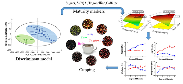 未成熟咖啡豆是最主要的一种瑕疵豆,会引起咖啡的不良涩味,一旦掺杂进商品豆中,便难以区分,从而影响咖啡整体的品质。因此,邱明华团队利用基于1H NMR的化学计量学分析的方法对影响咖啡成熟度的标记物进行了探究和追踪分析,建立了快速鉴别咖啡未成熟豆的偏最小二乘判别分析(PLS-DA)区分模型,深入研究了成熟度标记物在不同成熟程度鲜果中的积累情况,并结合咖啡杯测,阐明了成熟度标记物的积累与咖啡品质之间的关系,这为了解云南咖啡品质形成机制,控制咖啡鲜果的最佳采摘时期,保障云南咖啡的优质品质,提供了重要的理论依据。研究成果发表在Food Research International(2020, 132: 109121; DOI:10.1016/j.foodres.2020.109121)。