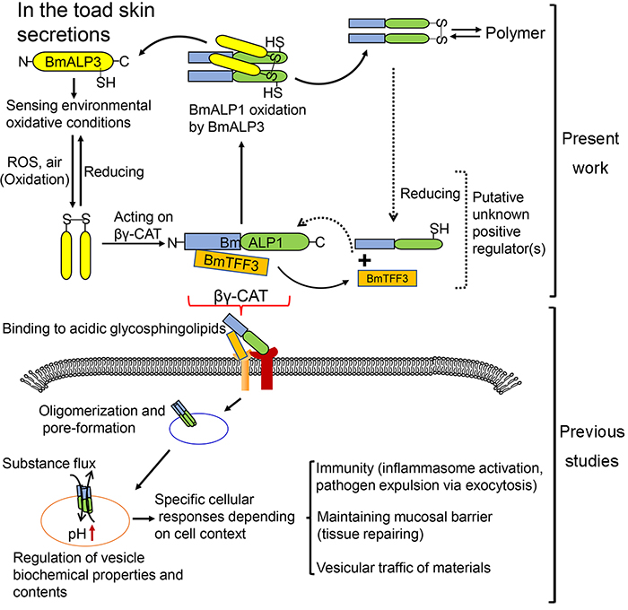 以两栖动物为模型开展的研究为生命科学进程做出了很多杰出的原创性贡献,如肌肉代谢、神经传导的化学基础、体细胞克隆等。两栖动物的皮肤担任呼吸、水平衡、粘膜屏障和免疫的重要生理功能,但对其中的细胞生物学原理和分子生物学基础知之甚少。与人们熟悉的传统膜蛋白(包括膜受体、离子通道和转运体等)不同,孔道形成蛋白(Pore-forming protein)是一类非经典膜蛋白,其特征在于以分泌型单体可溶性形式存在,特定条件下通过寡聚化后再插入生物膜系统形成膜通道。目前对孔道形成蛋白的认识主要集中于它们的细胞毒作用,而对它们其他的细胞功能和作用途径知之甚少。