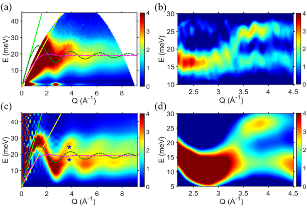 图1.中子散射结合分子动力学模拟对Zr46Cu46Al8金属玻璃中类声子属性的研究。此研究结果首次在非晶体系中测得高频横声学支声子振动模。(a)(c)分别为非弹性中子散射实验和分子动力学模拟得到的类声子态密度分布;(b)(d)分别对应(a)(c)中数据的二次微分结果。