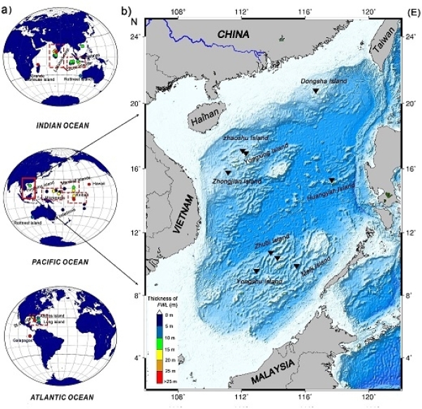 (a)全球珊瑚岛礁部分地下淡水透镜体的分布及厚度情况,(b)为南海主要的珊瑚岛礁