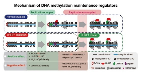 研究发现,DNA甲基化可以在复制叉经过后数分钟内迅速恢复到较高的水平,说明存在一个复制偶联的快速维持阶段;即使复制叉经过后数小时,甲基化维持仍在进行,说明同时存在一个复制非偶联的缓慢维持阶段。
