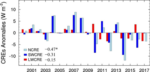 针对以上问题,中国科学院大气物理研究所研究人员等人2019年基于CERES-EBAF卫星反演、ERA-Interim再分析资料及区域模式考察了中国东南部云短波辐射效应的维持机制,近期进一步考察了其年际变化特征。最新结果表明,2000年以来该区域春季云短波辐射效应呈现弱的增强趋势,在多数年其异常值也强于云长波暖化效应,意味着云辐射冷却主导着该区域云辐射效应的气候态及年际变化(图2)。此外,云短波辐射效应的年际变化明显不同于区域云粒子有效半径和气溶胶光学厚度,但与区域850hPa-500hPa平均的垂直速度有很好的正相关,两者在2000年-2017年的时间相关可以达到0.76,而且上升运动偏强(弱)年与云短波辐射效应偏强(弱)年完全对应(图3)。这表明该区域云辐射冷却效应的年际变化主要受环流条件影响。