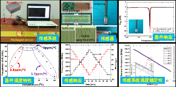 研究人员选用具有良好温度特性的Y切35度压电石英晶体,通过有限元与耦合模理论优化设计出高品质因子(Q-value>12000)单端谐振型传感器件,结合射频读取模块与封装设计构建无线无源声表面波应变监测系统,并搭建测试平台对系统性能进行评测。研究显示,系统灵敏度达到598Hz/με(微应变),温漂小于1.8%(<80oC),无线信号传输距离为2米。
