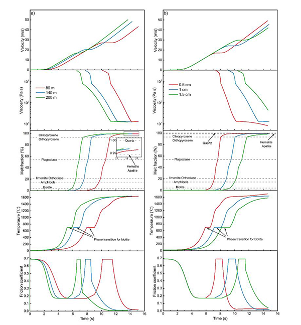该研究将热熔过程划分为三个阶段:弱化阶段、剪切强化阶段和热熔润滑阶段,并分别构建三阶段滑带温度场与运动演化方程,定量评价高速滑坡运动演化过程中速度、粘性系数、熔融体体积分数、温度及摩擦系数变化趋势,探索不同功率转化系数下,热熔现象对不同规模整体性滑坡运动的影响。高速滑坡第一阶段摩擦弱化机理缘于剪切带颗粒破碎和闪热,摩擦系数演化趋势可采用指数衰减方程描述。第二阶段摩擦强化有两个原因:其一是熔融体填充部分孔隙,增加了滑动面接触面积;其二是熔融体和固体颗粒混合增大了剪切带强度,基于矿物选择性熔融特性,并考虑熔融体体积分数,量化剪切带强度增量。第三阶段:当熔融体含量达到一定程度时,滑体和基岩被熔融体分开,滑坡剪切阻力由粘滞阻力提供,在此阶段,考虑温度、化学成分、碎屑含量、含水量等因素对粘性系数的影响,建立热传导方程和应力场方程,计算不同滑体厚度和剪切带厚度条件下各参数的变化趋势。