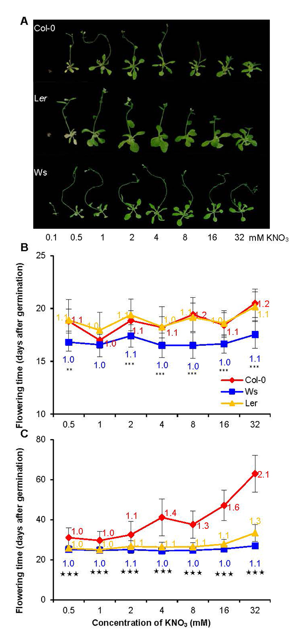 近期,中国科学院昆明植物研究所研究员胡金勇团队从拟南芥自然变异响应氮浓度变化协调开花时间角度进行探索。研究探索了拟南芥三种自然变异材料(Col-0、Ws和Ler)开花时间对不同KNO3浓度的响应,分析了拟南芥自然变异开花时间响应氮浓度与光周期的关系。研究发现,三种自然变异的开花时间差异性响应氮浓度变化,且这种响应具光周期依赖性;长日照条件下,Ler和Col-0开花时间对硝酸盐浓度变化的响应相当,Ws最弱;日中性光照条件下,三种自然变异的开花时间均显著晚于长日照条件,但Col-0对氮浓度变化的响应明显比Ler和Ws显著。自然变异的开花时间变化与主根长、侧根数目等生长特征仅有部分关联,且这种关联具基因型和光周期依赖性。不同自然变异响应氮浓度调整开花时间与SOC1和FT表达密切相关;光周期-生物钟途径GI、年龄途径SPL3/4/5和自主-春化途径FLC的表达可能参与调控拟南芥自然变异开花时间对不同氮浓度的响应。该研究丰富了对拟南芥开花基因调控网络的认识,为深入揭示氮营养与开花时间协同调控机制提供了基础数据。