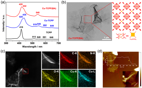 图2. Cu-TCPP(BA)的(a)紫外-可见吸收,(b)TEM,(c)元素映射和(d)AFM图。