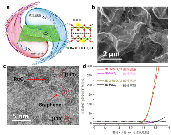 近日,中国科学院大连化学物理研究所催化基础国家重点实验室二维材料化学与能源应用研究组研究员吴忠帅团队开发出一种具有本征缺陷结构的氧化钌/石墨烯二维异质结催化剂,实现在全pH范围内高活性、高稳定的电解水析氧。