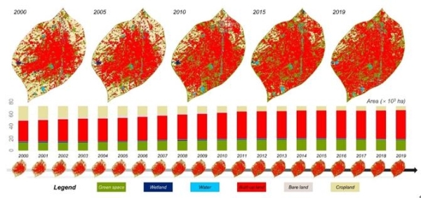 中国科学院东北地理与农业生态研究所城市森林与湿地学科组研究人员基于Google Earth Engine(GEE)云平台,针对城市景观首次开发了Landsat影像的锐化方法,保留原始光学信息、提升影像空间分辨率,结合植被物候、地表光学信息、方差最大法,提出了城市景观多级决策分类体系(MDR),探明了2000-2019年长春市15m空间分辨率的逐年景观动态。基于逐年景观动态,研究人员确定了景观动态突变年,并结合年鉴数据、遥感数据、气象数据,揭示城市景观动态的驱动机制、科学量化所产生的生态效应。