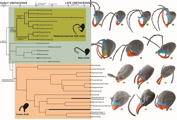蚂蚁是最成功的社会性昆虫之一,在现代陆地生态系统中扮演重要角色。蚂蚁的起源和早期演化吸引了广泛关注。长期以来,学界普遍认为早期蚂蚁的形态和生态较为单一。近年来,各国学者从白垩纪琥珀中发现一系列原始蚂蚁(如驼蚁、魔蚁),改变了对早期蚂蚁演化历史的认识。