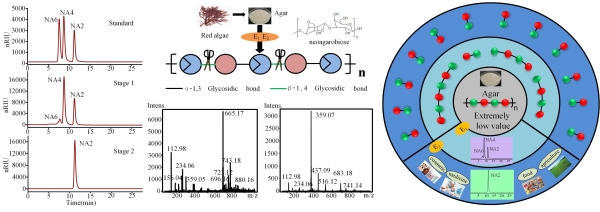 中国科学院天津工业生物技术研究所研究员孙媛霞带领的功能糖与天然活性物质研究团队,从海洋微生物中挖掘得到两种新型琼胶酶AgaA和AgaB。研究发现,AgaA是一种热稳性高的内切型琼胶酶,具有较强的糖苷水解作用,降解琼脂多糖生成低聚琼寡糖;AgaB是一种外切型琼胶酶,具有较高的底物特异性,生成产物为聚合度均一的新琼二糖。在此基础上,研究团队建立双酶偶联降解琼脂生产新琼二糖工艺,在60℃下对高浓度的琼脂底物进行脱胶液化,然后对产物聚合度进行均一化处理,获得新琼二糖的纯度达90%以上,原料转化率接近94%,为绿色、高效制备新琼寡糖提供新策略。