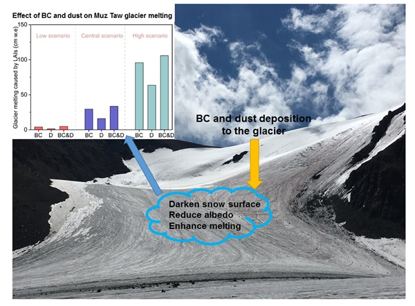 该研究加深了关于吸光性杂质对中亚地区冰川消融影响的认识,为进一步探讨流域尺度上水文过程以及水资源变化提供了基础数据。相关成果以Effects of black carbon and mineral dust on glacial melting on the Muz Taw glacier, Central Asia为题,发表于环境科学期刊Science of the Total Environment。西北研究院副研究员张玉兰为第一作者、康世昌为通讯作者。研究得到中科院战略性先导科技专项、国家自然科学基金、第二次青藏科考项目、“西部之光”以及冰冻圈国家重点实验室自主课题等联合资助。