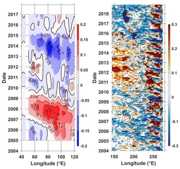 图2.观测到的热带印度洋(左,15°S)和太平洋(右,10°N)温跃层盐度沿等密度面的西向传播特征(Hu et al. 2019,2020)