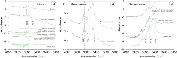 中国科学院地质与地球物理研究所研究员苏本勋及合作者,对特提斯构造带内的数个蛇绿岩型铬铁矿床进行多维尺度的观察。野外尺度上,从围岩方辉橄榄岩到纯橄岩薄壳到铬铁矿体,硅酸盐矿物的蚀变程度逐渐变强;手标本和镜下尺度,铬铁矿含量越高的矿石,硅酸盐矿物蚀变越强,在条带状铬铁矿石中表现得尤为明显(图1)。该现象与后期外来流体导致的蚀变明显不同,暗示这些选择性蚀变主要是自蚀变,并与铬铁矿含量密切相关。硅酸盐矿物的水含量分析发现,矿石中铬铁矿含量越高,橄榄石的水含量越高;矿石中橄榄石水含量均高于纯橄岩;方辉橄榄岩中的橄榄石水含量最低(图2)。该定量分析进一步表明,橄榄石水含量与铬铁矿含量呈正相关关系。基于此,研究人员提出铬铁矿汇聚成矿过程中“湿铬铁矿”和“选择性蚀变”的概念。