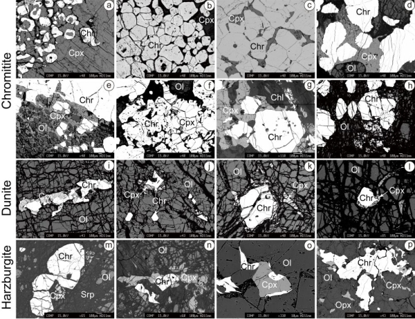 图4.不同类型铬铁矿石中单斜辉石的产出形态及纯橄岩和方辉橄榄岩中单斜辉石和铬铁矿的共生现象