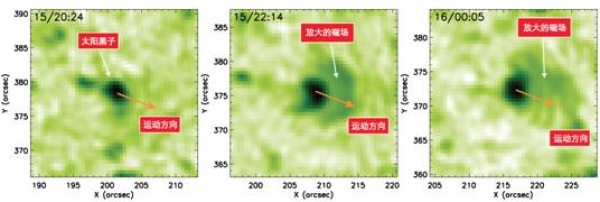 黑子快速运动的过程,分别展示了黑子在运动开始时、进行中、以及即将结束时的状态。在黑子前方,出现了由于磁场的放大而形成的类似黑子半影的结构