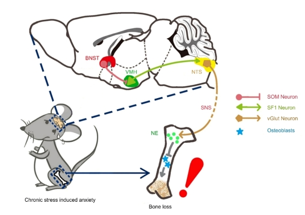 随着现代社会发展与生活节奏加快,人们的压力应激显著增加。长期慢性压力应激会导致人体出现各类疾病,包括情绪障碍、骨质疏松以及代谢异常等。在70、80年代,临床研究发现,焦虑症或抑郁症的病人的骨密度低于常人,这提示压力应激导致的焦虑可能与骨丢失密切相关,但生物学机制尚不清楚。在航天医学中,传统观点认为航天员骨丢失是由于外太空环境的重力缺失引起,然而近年来研究发现航天员即使长时间锻炼后骨量仍有持续性丢失,这提示密闭隔离等特殊环境造成的慢性压力应激或加剧航天员的骨丢失。压力应激下大脑的功能状态可能通过神经系统对外周骨代谢产生持续的负面影响作用,然而,迄今为止该作用的生物学机制尚不清楚。