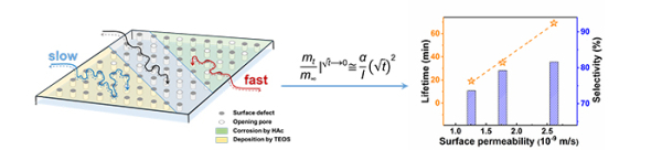 研究团队利用化学液相沉积法与酸蚀技术修饰SAPO-34分子筛的晶体外表面。根据前期提出的表面渗透率公式,研究人员直接测定修饰前后的分子筛的表面渗透率,定量得到分子筛的表面传质阻力。采用该方法修饰分子筛外表面过程中,分子筛形貌、内部孔道结构、酸性质与晶内扩散性质几乎不变。研究发现,控制相关客体分子在分子筛晶体上的表面传质能力,降低其表面阻力,有助于加快客体分子进出分子筛晶体,最终延长分子筛寿命,提高低碳烯烃选择性。该研究通过定量改变表面阻力来控制MTO催化反应的性能,揭示表面阻力在分子筛催化中的重要作用,展示出控制反应和扩散这一对介尺度作用机制可直接调控分子筛催化反应性能的新思路。