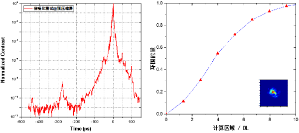 皮秒脉冲产生系统的信噪比测试结果(左)和焦斑环围能量曲线(右)