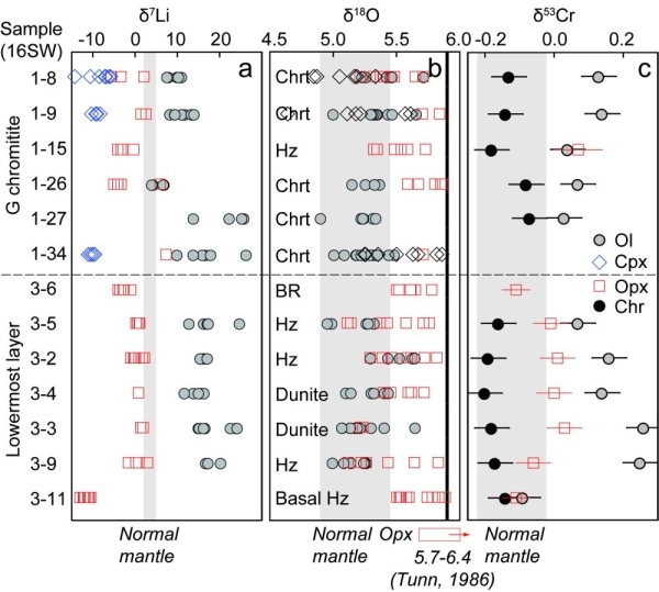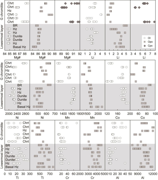 中国科学院地质与地球物理研究所研究员苏本勋及其合作者,对北美Stillwater大型层状镁铁-超镁铁杂岩体的超镁铁岩和铬铁矿石进行矿物岩石学观察和元素及Li-O同位素分析。结果显示:(1)最早结晶的橄榄石和铬铁矿极少直接接触,多由斜方辉石和/或单斜辉石等粒间矿物相隔;不同岩相以及不同类型铬铁矿石之间,矿物组合和橄榄石颗粒大小呈规律性变化(图1)。(2)铬铁矿石中的硅酸盐矿物元素含量(尤其是过渡族元素和流体活动性元素)明显区别于方辉橄榄岩和纯橄岩;铬铁矿石中橄榄石的元素含量变化范围较斜方辉石更大,而方辉橄榄岩和纯橄岩中橄榄石的元素含量变化范围较小(图2)。(3)橄榄石具有重于共生斜方辉石和单斜辉石的Li同位素组成,且δ7Li值的变化范围较大(图3a);大部分橄榄石的O同位素组成在正常地幔范围内,斜方辉石的δ18O值多高于正常地幔值,单斜辉石则具有最大的δ18O变化范围(图3b);异常的矿物Cr同位素组成,即δ53Cr呈现橄榄石>斜方辉石>铬铁矿规律(图3c;Bai et al. GCA 2019)。(4)矿物元素和同位素组成与不同岩相转变过程中矿物组合、矿物颗粒大小存在一定联系(图4)。