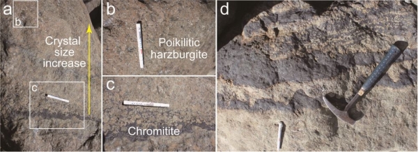 图4.Stillwater层状岩体中的铬铁矿细脉的产出形态及其与橄榄岩的接触关系