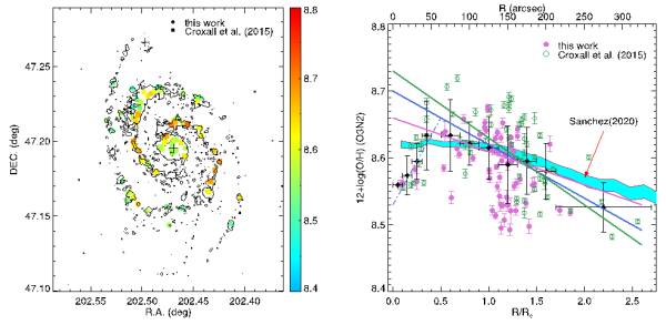 中国科学院新疆天文台光学天文与技术应用研究室科研人员魏鹏等利用国家天文台2.16m望远镜和美国6.5m MMT望远镜对近邻相互作用星系M51-NGC5195中恒星形成区(H II)的高空间分辨率光谱观测数据,探究H II区的物理特性,包括气相尘埃、星族年龄、恒星形成率面密度和气相金属丰度。研究发现,M51的核球及围绕核球的恒星形成环区域的气相金属丰度呈现正梯度径向分布(图1),这或是核球主导的星系由于内部恒星形成熄灭而导致的化学增丰冻结。M51星系盘气相金属丰度径向轮廓呈现负梯度分布,这支持M51为“inside-out”的星系增长模式。
