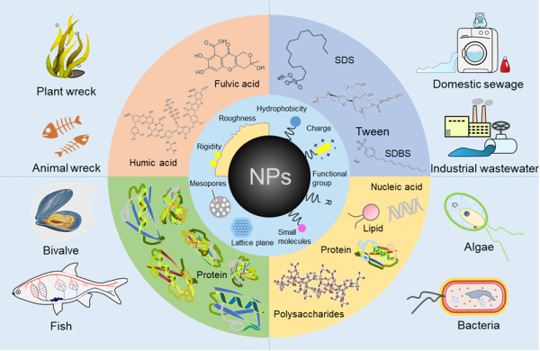 图二. 水环境中纳米颗粒表面形成“环境冠”的主要特征示意图