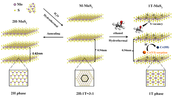 为此,科研人员在一步水热反应得到混合相MoS2的基础上,利用乙醇进行相调制,合成具有宽层间距结构和丰富硫空位的1T-MoS2。研究表明,该1T-MoS2中1T相的百分比含量接近100%,且在暴露的空气中能保持360天稳定。在乙醇诱导的溶剂热反应过程中,MoS2原位形成的硫空位对促进2H相向1T相的转化具有重要意义。结合分子动力学模拟,揭示乙醇与MoS2表面间存在强相互作用,降低MoS2纳米片的总能量,从而增强1T-MoS2的稳定性。进一步研究发现,1T-MoS2纳米片显示出优异的Cr(VI)吸附能力(pH=6时为200.3mg·g-1),是混合相MoS2的两倍以上,并可在吸附循环过程中维持稳定的相结构。