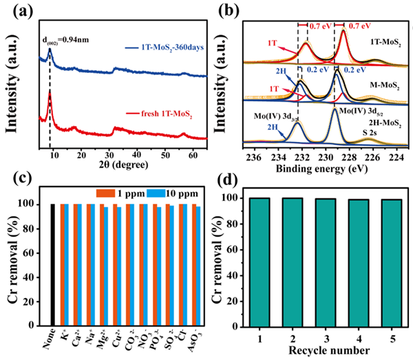图2.(a)1T-MoS2放置一年时间的XRD晶体结构表征;(b)Mo元素的高分辨XPS谱图;1T-MoS2对水体中Cr(VI)的(c)吸附性能以及(d)循环稳定性