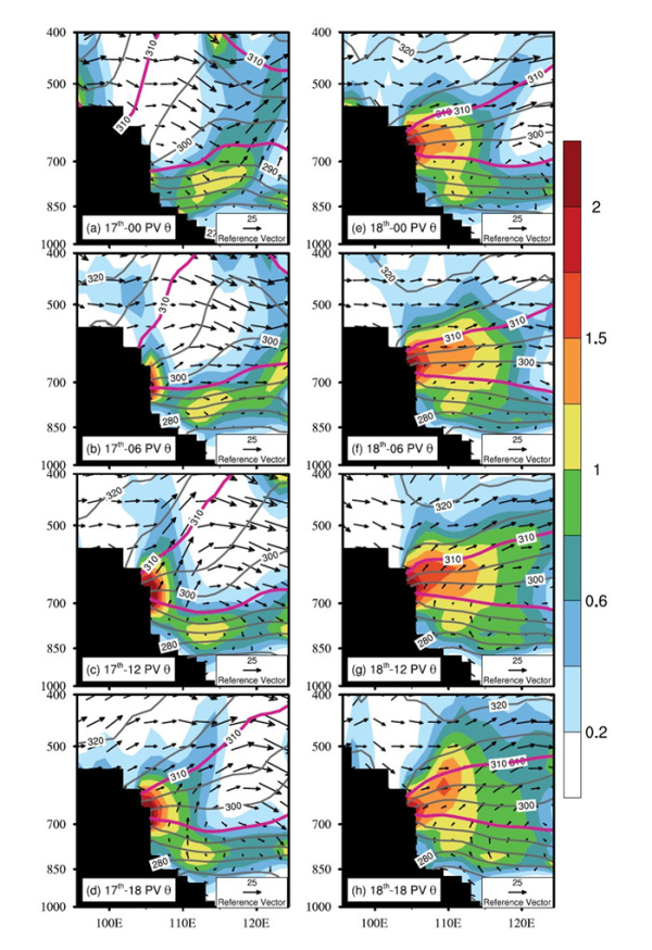图1.2008年1月17日00时(世界时)至18日18时位涡(阴影,10-6 K m2 s-1 kg-1)、位温(等值线,K)和风场(矢量,m s-1)沿33oN的垂直剖面(原文中图2)