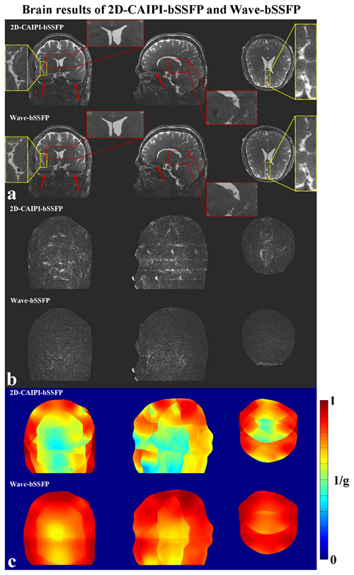 图4.研究团队所提出技术(Wave-bSSFP)和鸡尾酒技术(2D-CAIPI-bSSFP)用于加速平衡稳态自由旋进成像结果(a),以及所对应的误差图(b)和几何因子图(c)