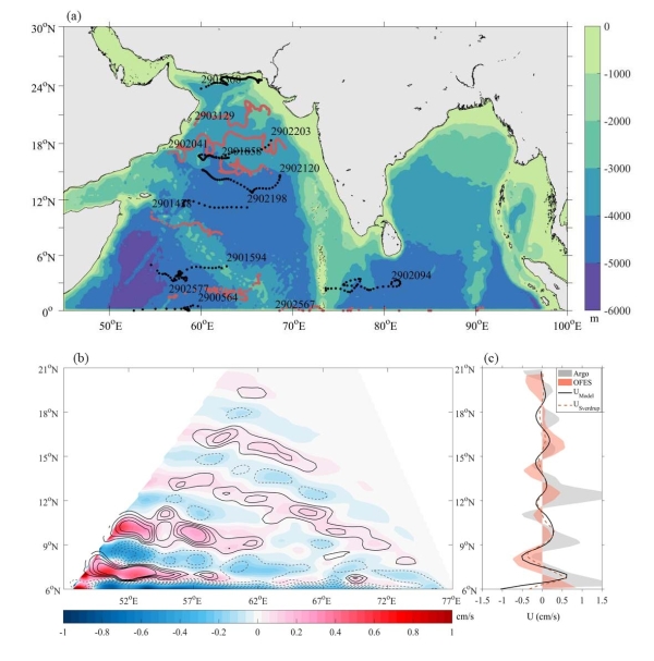 (a)北印度洋地形分布以及13个Argo浮标在1000db层的移动轨迹(经过5点滑动平均),表层误差通过Park等2005年的方法消除。(b)从一层半模式中输出的纬向速度(填色)以及用湍流Sverdrup平衡计算的纬向速度(等值线、实线/虚线表示向东/向西流动)。(c)由模式结果(实心黑线)和湍流Sverdrup平衡(红色虚线)得到的纬向平均速度,Argo轨迹计算的纬向平均速度(灰色阴影区)和OFES模拟得到的纬向平均速度(橙色阴影区)。
