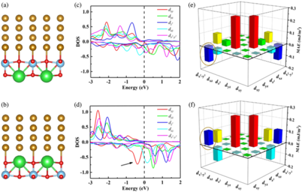 图1.(a)和(b)分别为TiO2-BTO/Fe和BaO-BTO/Fe结构图,黄色、绿色、蓝色和红色分别表示Fe、Ba、Ti和O原子;(c)和(d)分别为TiO2-和BaO-终端中Fe原子态密度;(e)和(f)分别为TiO2-和BaO-终端中Fe原子轨道分辨MAE