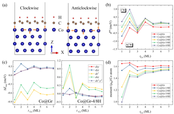 图2.(a) Co(4ML)/Gr-4/8H的CW和ACW示意图,箭头表示旋转方向;(b)表示不同氢浓度DMI对Co层厚度的变化;(c)Co/graphene和Co/graphene-4/8H中与DMI相关的SOC能量随Co厚度的变化;(d)不同氢浓度下Co原子的平均磁矩随厚度的变化