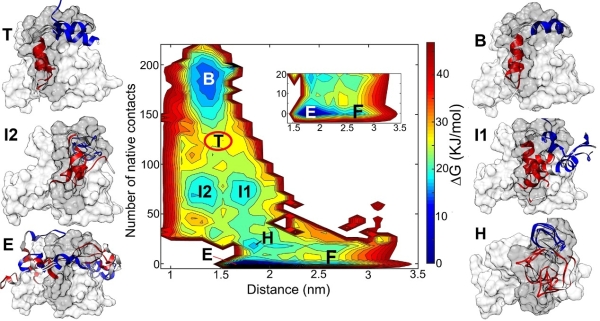 磷酸化之后的pKID与KIX结合过程的自由能变化图。从未结合的自由态(F态)到完全结合态(B态),需要经过一系列关键中间态,中间态的结构特征表明pKID上形成的特定疏水团簇结构(HRC)对于蛋白结合具有决定作用