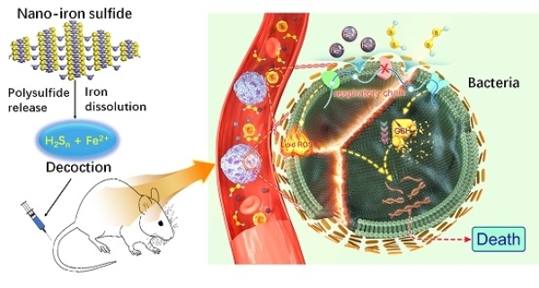 研究团队长期从事纳米酶的开发及其抗菌应用,聚焦铁基纳米酶的过氧化物酶活性模拟免疫抗菌机制,为克服细菌耐药性提供新的策略和治疗方法。2007年,研究人员首次发现氧化铁纳米酶具有类过氧化物酶活性,近年来又发现氧化铁纳米酶可以清除口腔细菌生物膜,杀死胞内沙门氏菌,最近又开发了硫化铁纳米酶并发现其具有高效的抗菌性能。研究人员最初利用纳米酶杀菌时主要是借助其过氧化物酶活性催化双氧水产生自由基来杀菌,但是实验过程中多次发现单独的氧化铁纳米酶(无双氧水)也具有一定的杀菌效果,通过提高ROS水平并导致细菌产生形变,尤其是硫化铁纳米酶,单独使用即可快速杀死多种细菌,但对这些现象背后的机制了解甚少。研究人员最初推测硫化铁纳米酶中释放多硫化氢来杀伤细菌,但单独的多硫化物分子杀伤效率有限。