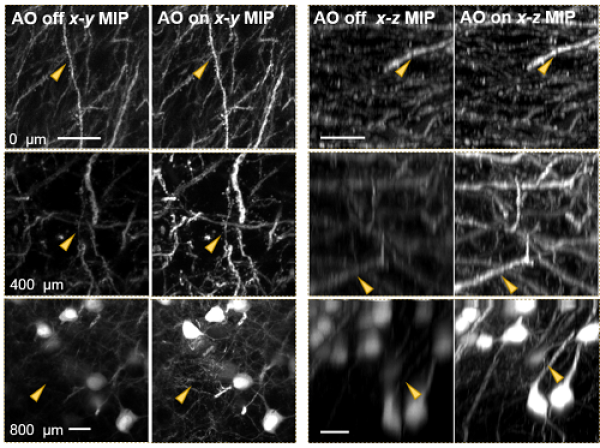 图1.对Thy1-GFP-M小鼠脑片成像结果比较。四个比较面均为XZ面,TPM: 双光子成像,AO MR-TPM:基于自适应光学和多帧重构的双光子成像,Scale bar:10 μm