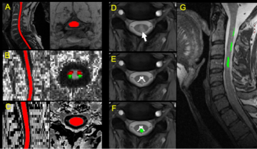 图1.(A)脊髓结构分割示意(B)各向异性分数(FA)图、脊髓丘脑束(红色)和皮层脊髓束(绿色)(C)磁转化图像分割(D)T2* 轴位图,显示灰质和病灶(E)灰质分割(F)病灶分割(G)病灶配准到T2结构像
