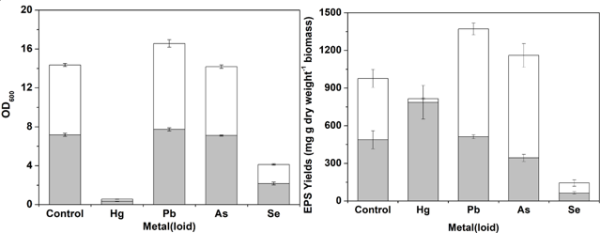 针对上述问题,中国科学院新疆生态与地理研究所环境污染与生态修复实验室副研究员宋文娟和英国邓迪大学地质微生物实验室教授Machael Geoffrey Gadd合作,研究重金属元素汞(Hg)和铅(Pb)、类金属元素砷(As)和硒(Se)对出芽短梗霉菌(Aureobasidium pullulans)的生长状态、EPS产量及组成的影响,以及EPS和(类)金属离子的配位络合作用。